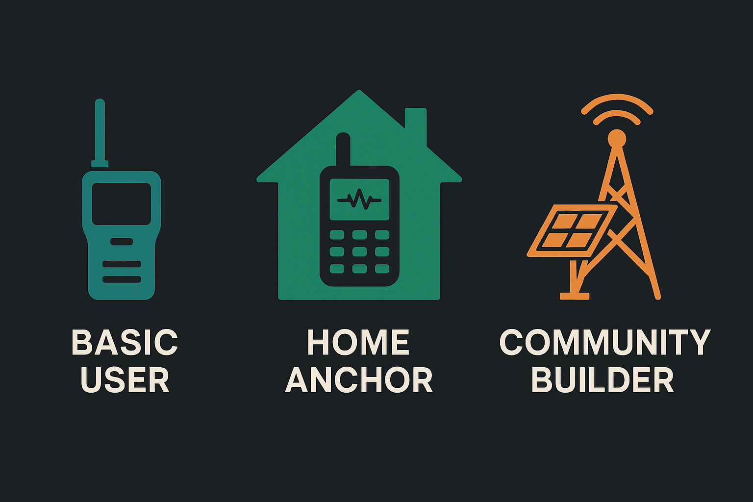 Shielded Signals role icons – basic user, home anchor, and community builder with solar-powered communication tower.